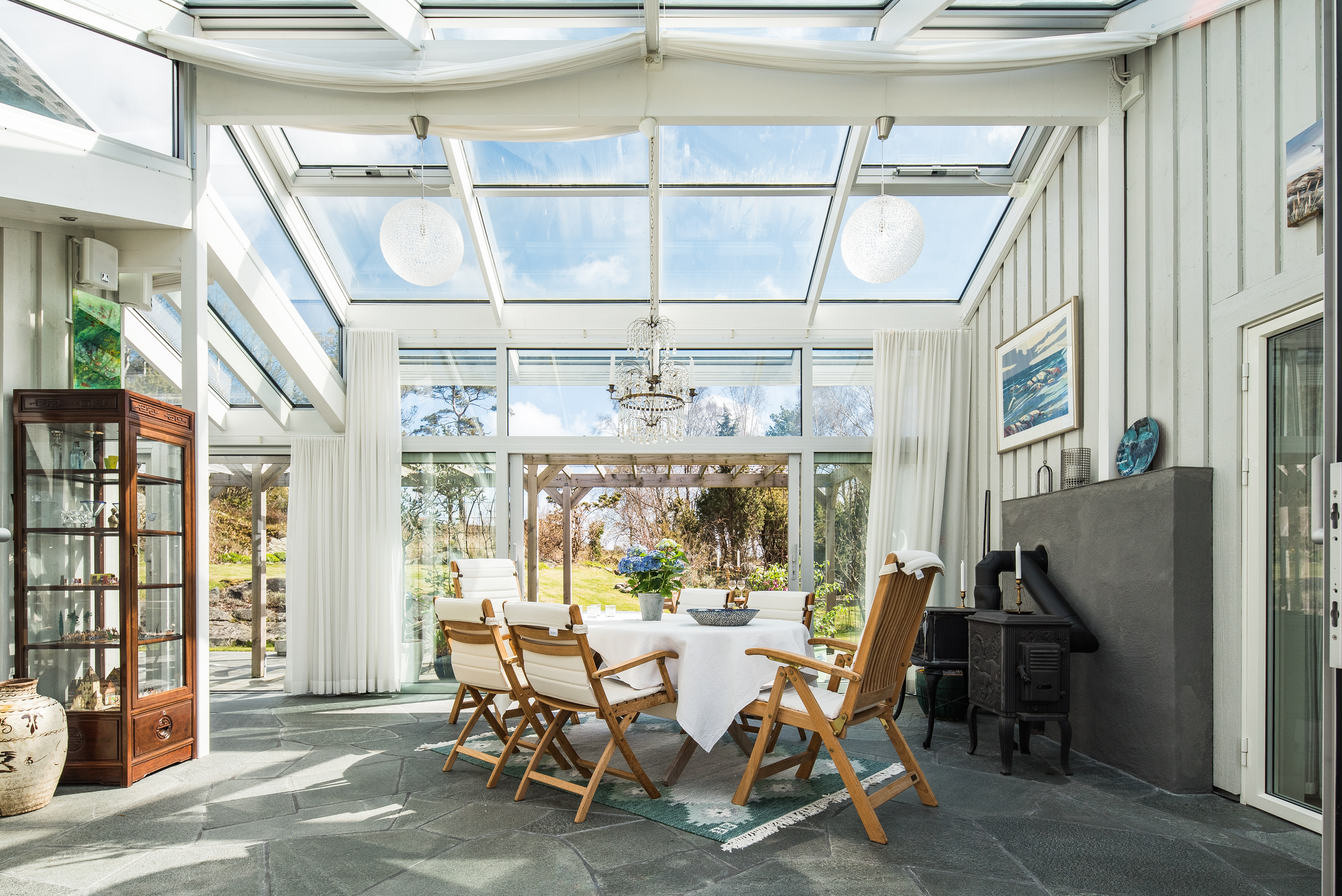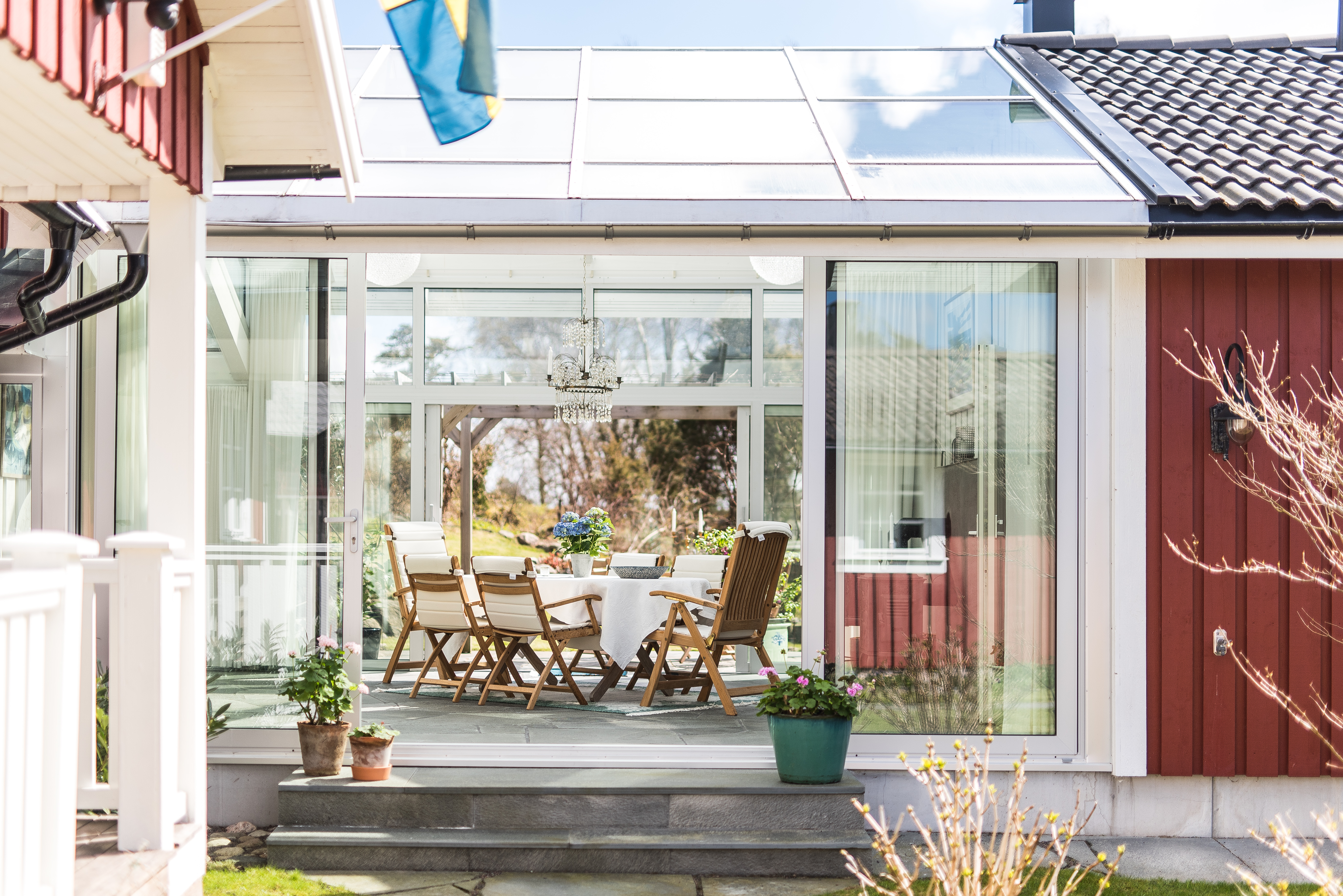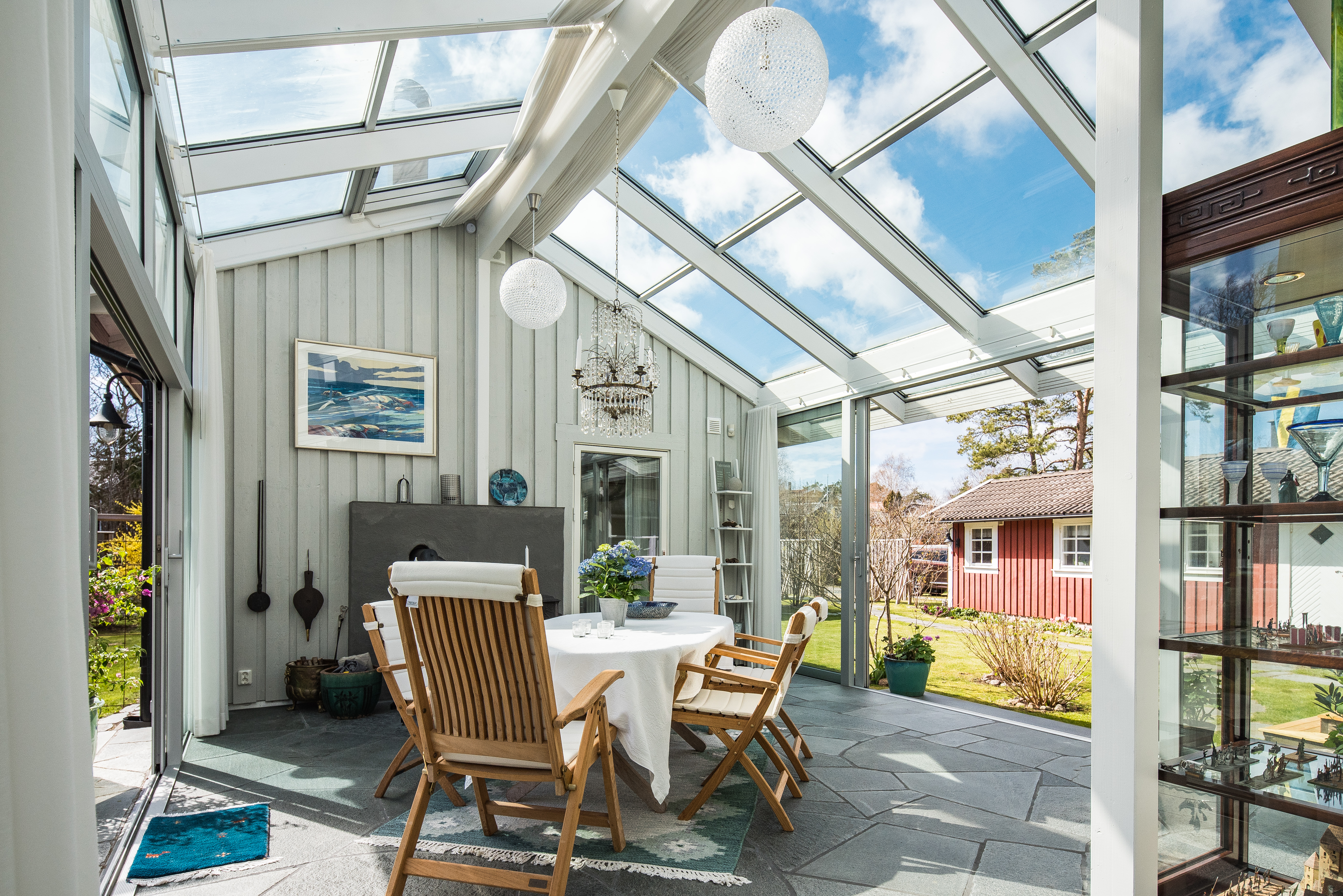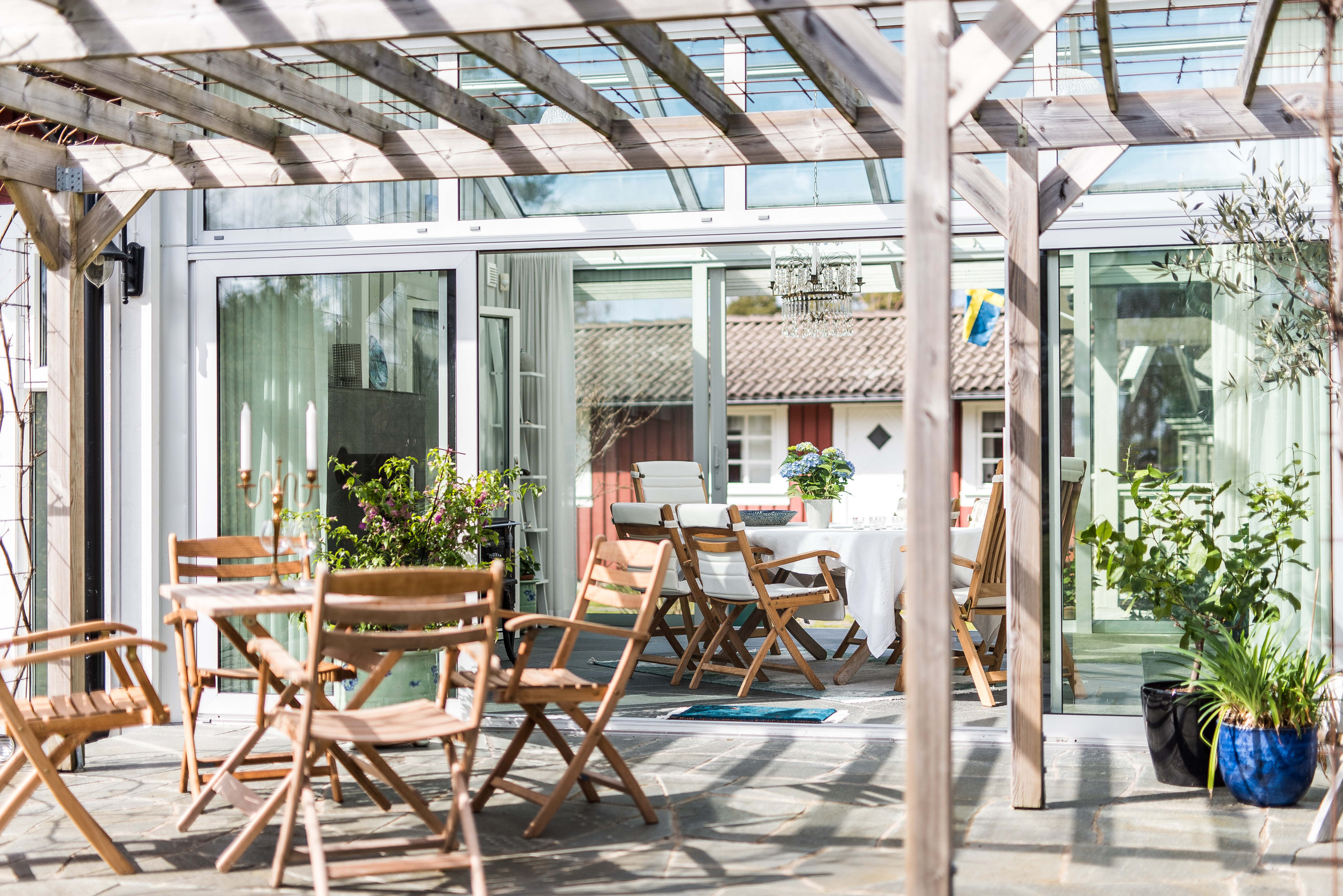 I anslutning till det inglasade rummet/vinterträdgården finns en stensatt och insynsskyddad uteplats.
