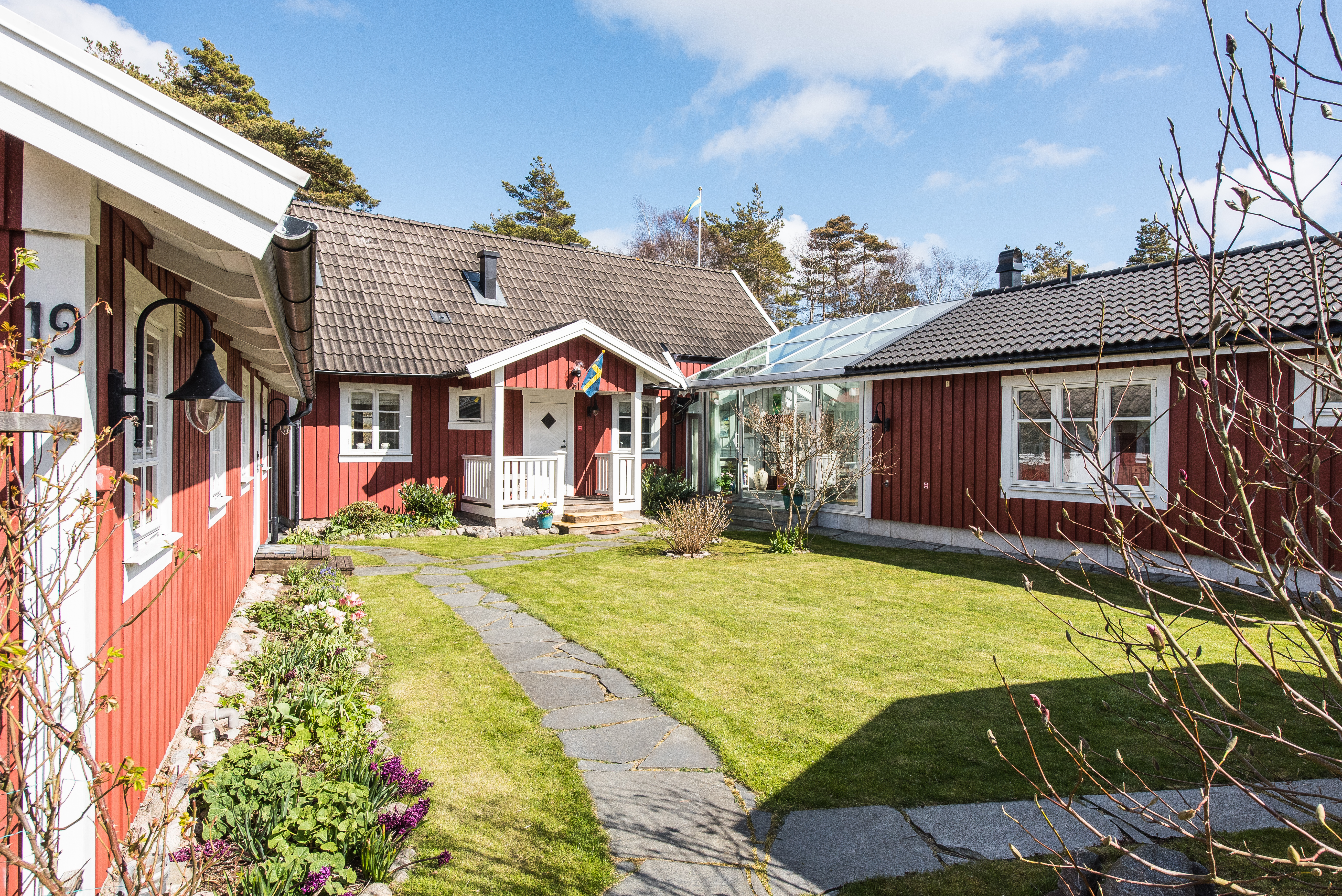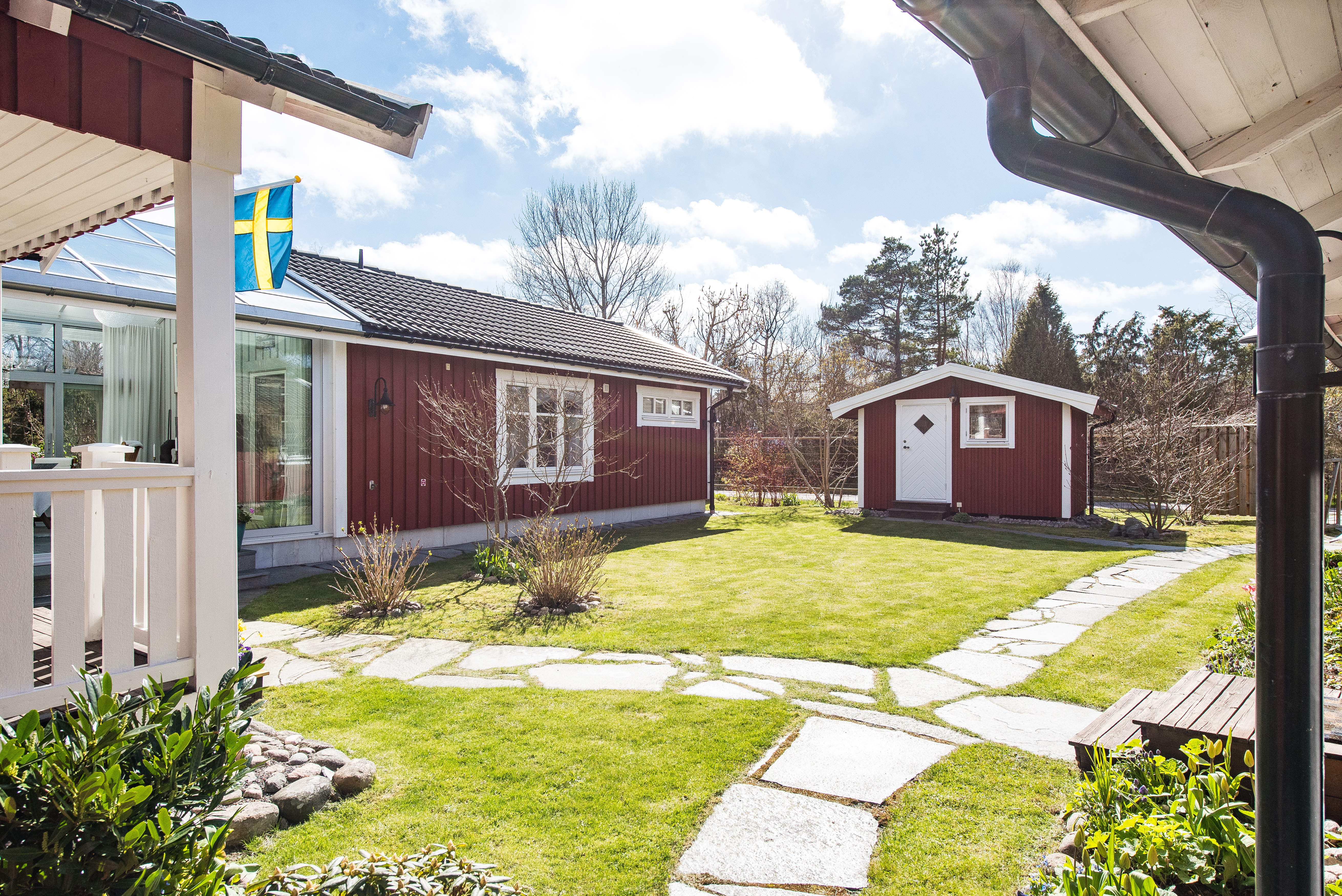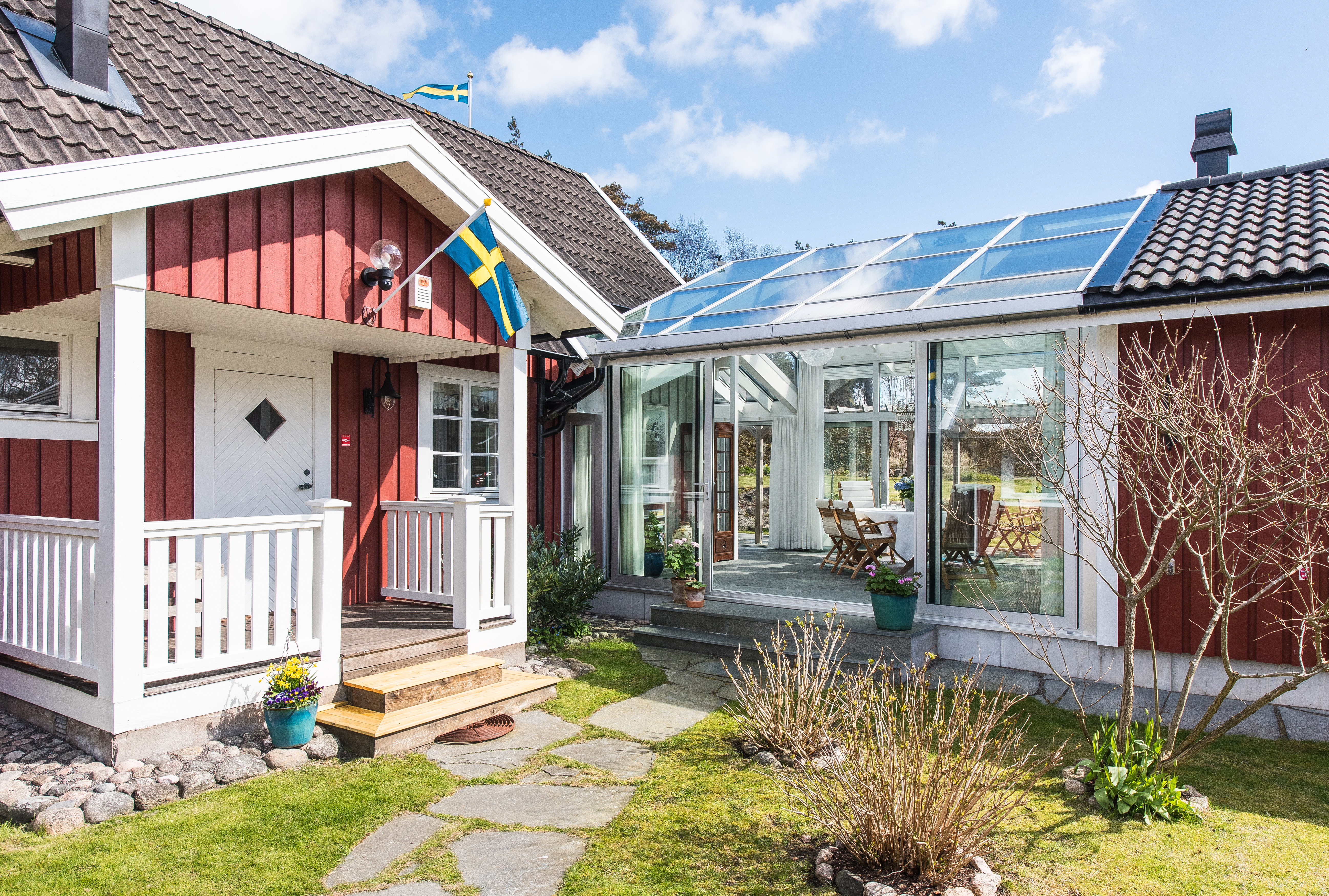 I anslutning till det inglasade rummet/vinterträdgården finns en stensatt och insynsskyddad uteplats.